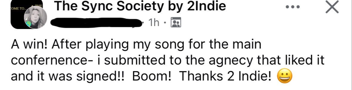 "Since joining 2Indie I have never been more excited and confident in my potential for success in the Sync world, and as an Artist!! The whole community welcomes new members with wide open arms and I have witnessed so many successful collaborations/placements amongst the students!! 2023 is truly gonna be an exciting and amazing year!! I highly recommend 2Indie to all music makers out there trying to get a leg up!!"